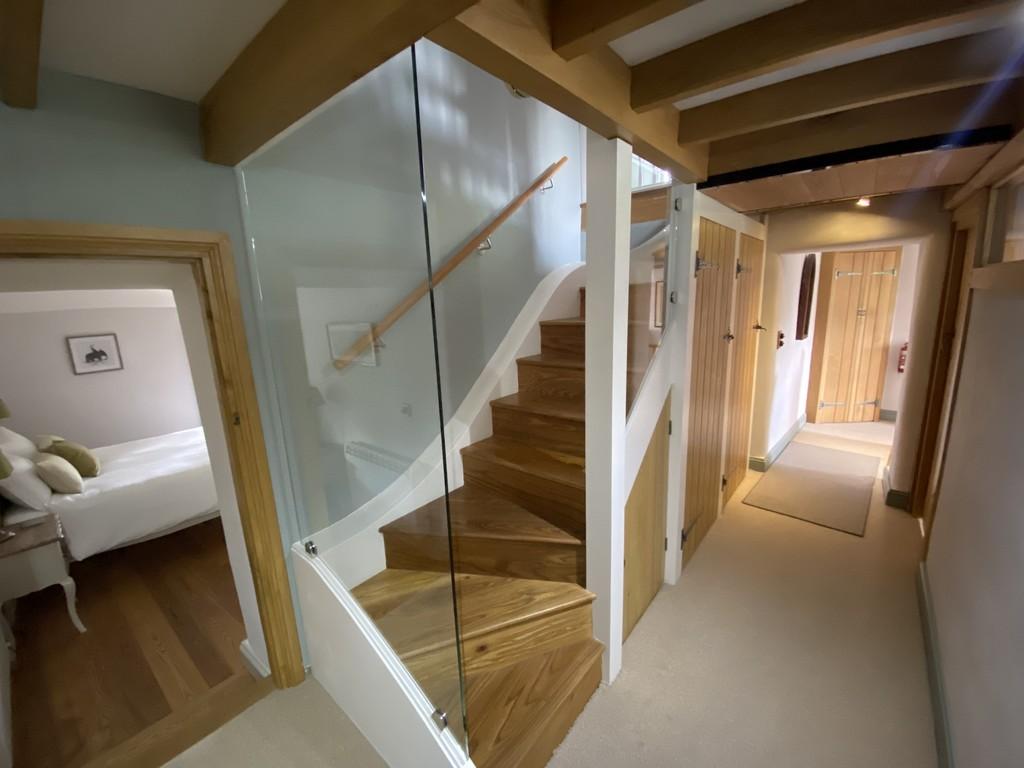 A period stone staircase leads up to a landing which has an oak balustrade and a lovely sitting space enjoying village views to the front, together with a fitted oak corner cupboard which houses the Wi-Fi connections and a home net hub. The inner landing has oak stairs rising to the second floor with balustrade and lovely exposed oak beams. On this landing, there is a cloakroom with attractive aqua panel surrounds having WC and wash hand basin together with a further useful understairs linen cupboard and separate storage.