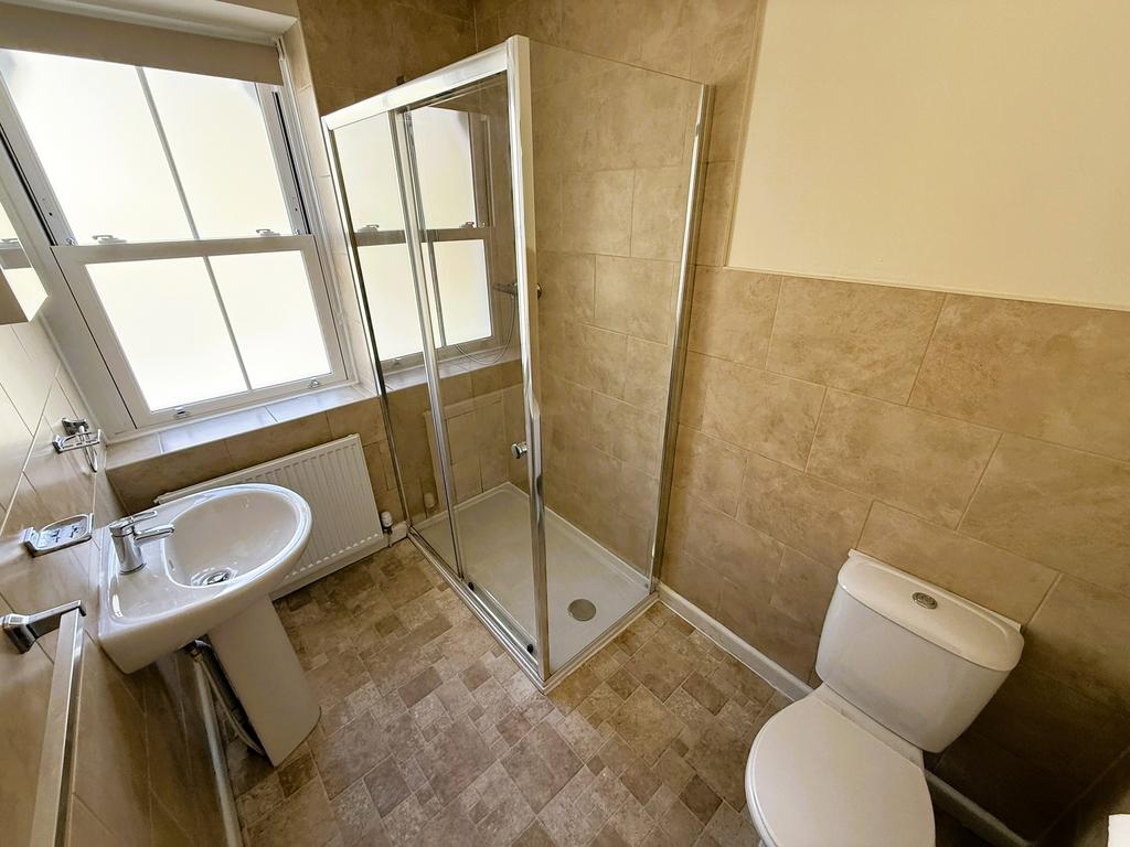 Double glazed sash window to front, pedestal wash and basin, part tiled walls, radiator, large glazed and tiled shower cubicle with mixer shower, radiator, low level flush WC and extractor fan.