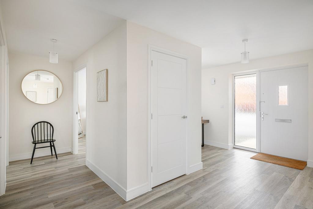 Inside, the accommodation spans approximately 1,087 sq ft and is finished to a high standard throughout. The spacious entrance hall immediately sets the tone — not only welcoming but also highly practical, with enough space to accommodate a mobility scooter, bikes, or a pushchair. It also benefits from a large storage cupboard and a generous airing cupboard, providing valuable hidden storage.