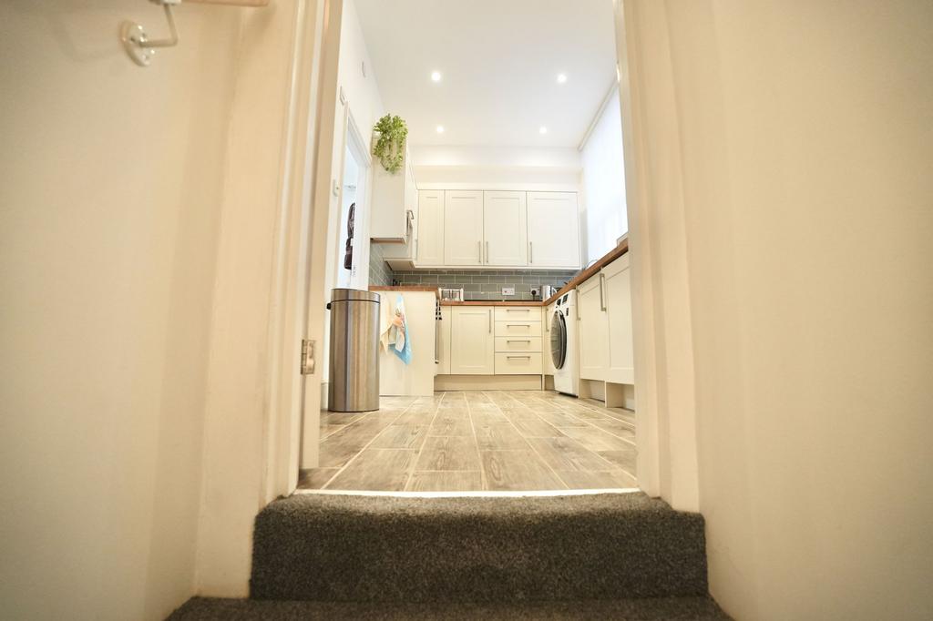 uPVC double glazed window to the side aspect, a range of fitted modern base and wall mounted units with wooden working surfaces over, inset ceramic sink with mixer tap over and side drainer, inset four ring gas hob, built in electric oven, tiled splashbacks, space and plumbing for washing machine, wood effect tiled flooring, wall mounted radiator, wall mounted gas fired boiler, inset ceiling downlighters, door to communal hall with further door to the rear leading to the outside parking area, door to the bathroom and door to the bedroom.