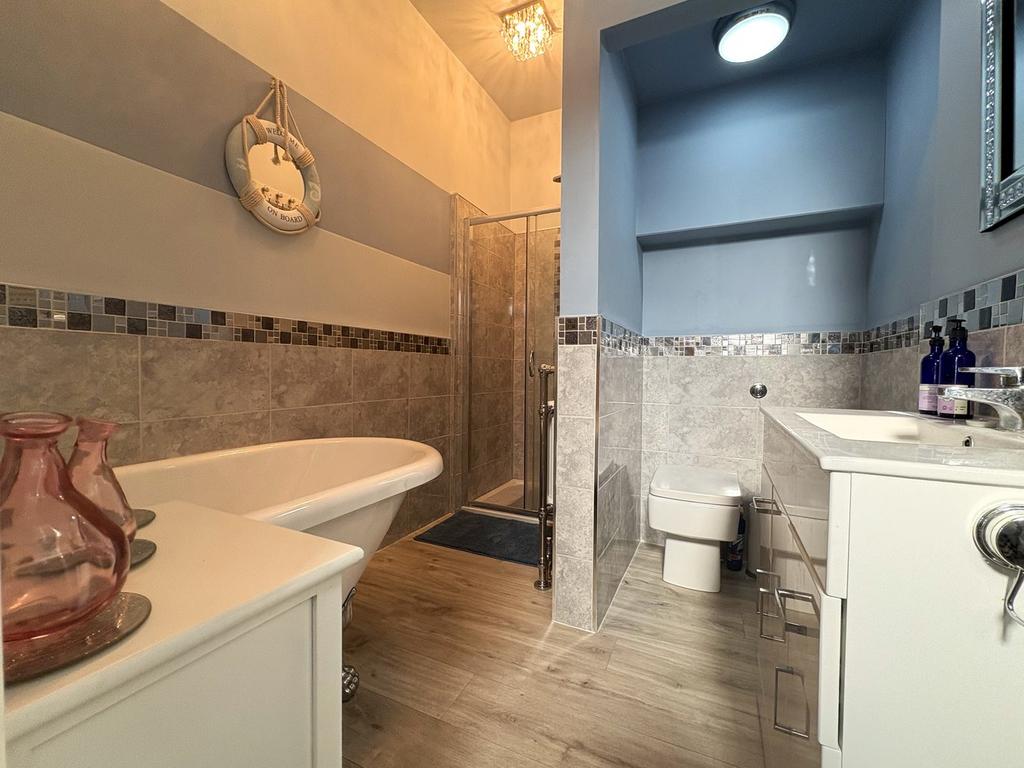 The bathroom has been stylishly fitted with a white suite, comprising; a WC with co-ordinating seat, a vanity style wash hand basin with chrome mixer tap and cupboards and drawers beneath. Good size walk-in shower with sliding door and attractive tiling to walls. Free standing clawfoot bath, with chrome mixer tap and a hand held shower attachment. Radiator.