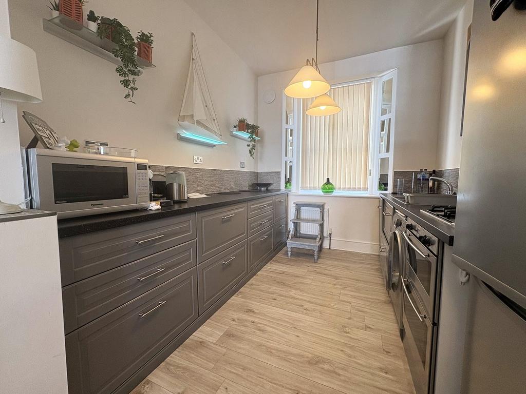 A delightful dual aspect room, with a recently replaced window to front offering absolutely breath-taking sea and beach views, and a window to rear in the kitchen.