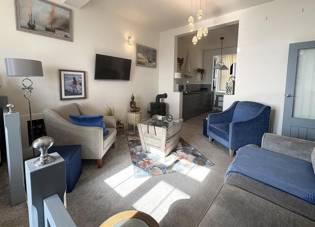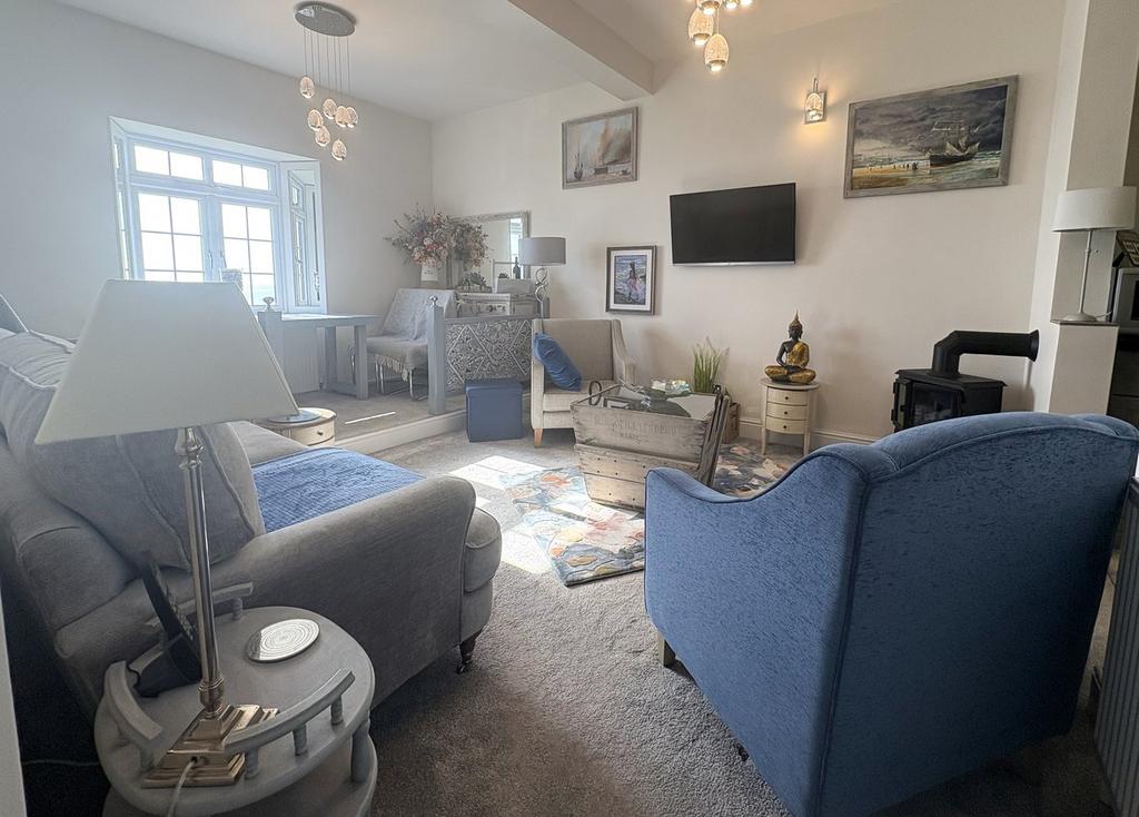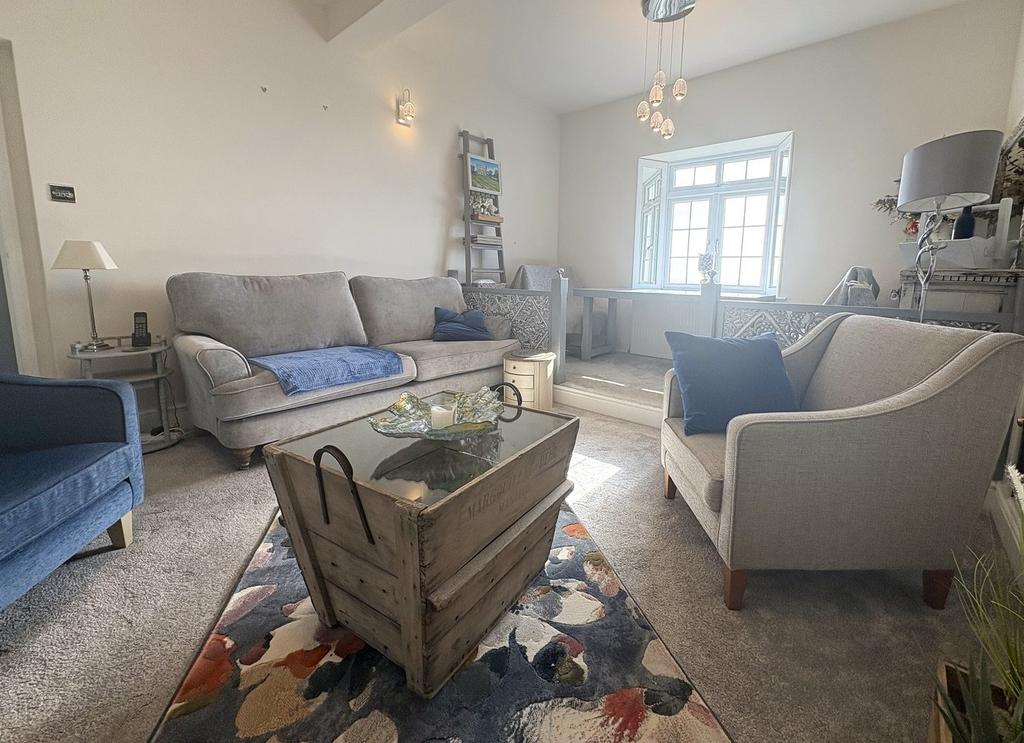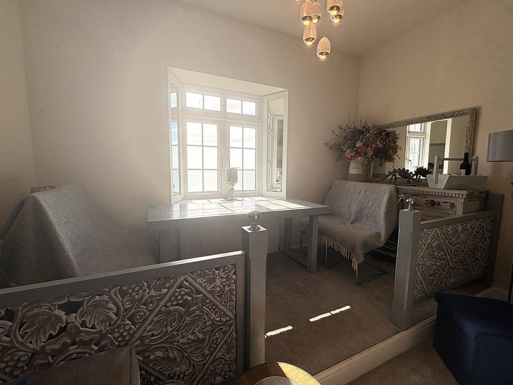 The open plan style room has been split into three sections, with a lovely bright living room with a radiator and a cold effect fire with a step up to the dining area, where there are glorious sea views.