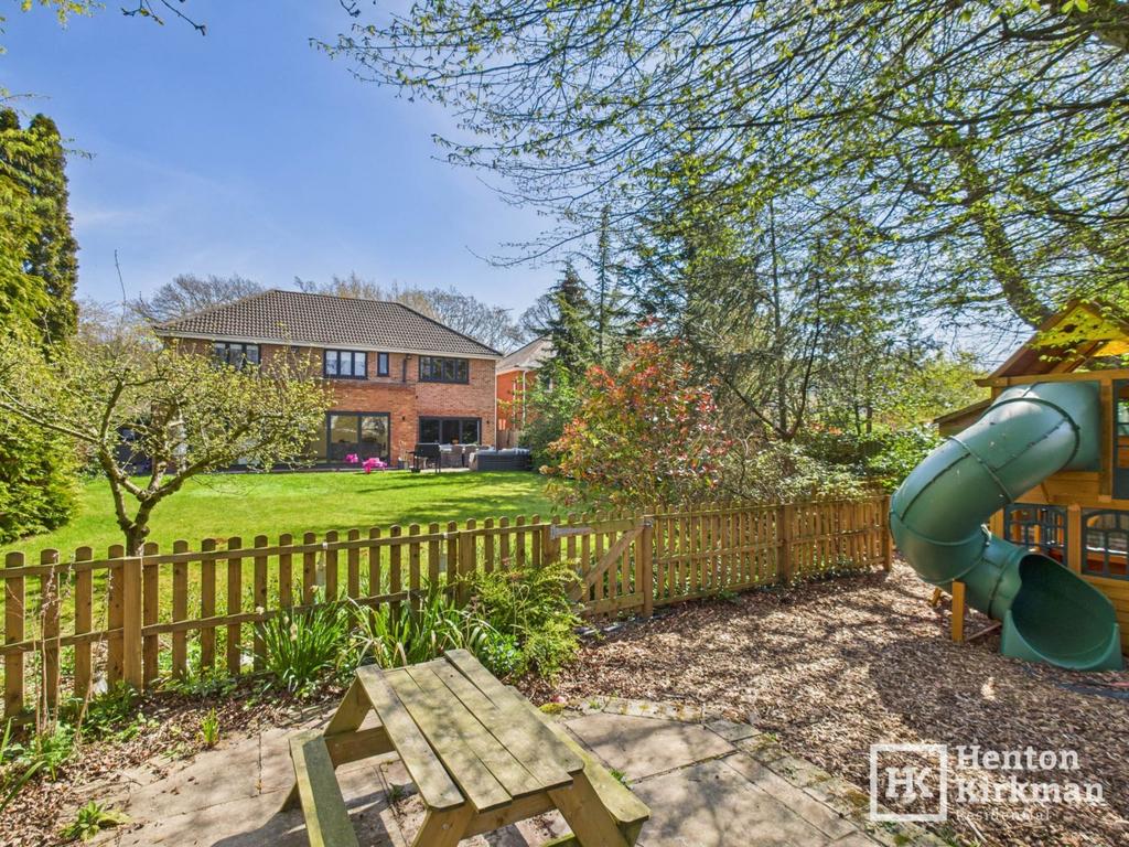 The main garden is laid to lawn with well-established planting, and to the rear there's a dedicated children's play area complete with a raised play cabin and a multifunctional timber climbing frame with swings and slides.