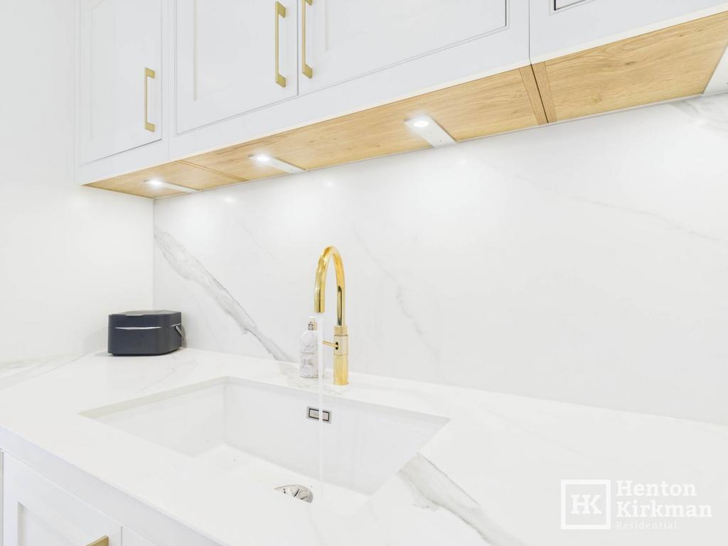The layout includes a handy all in one place' breakfast cupboard, an under-counter Blanco sink with a gold Quooker instant boiling mixer tap, while tucked subtly into the cabinetry is an illuminated, mirror-backed bar cupboard with its own dedicated drinks fridge beneath perfect for entertaining.