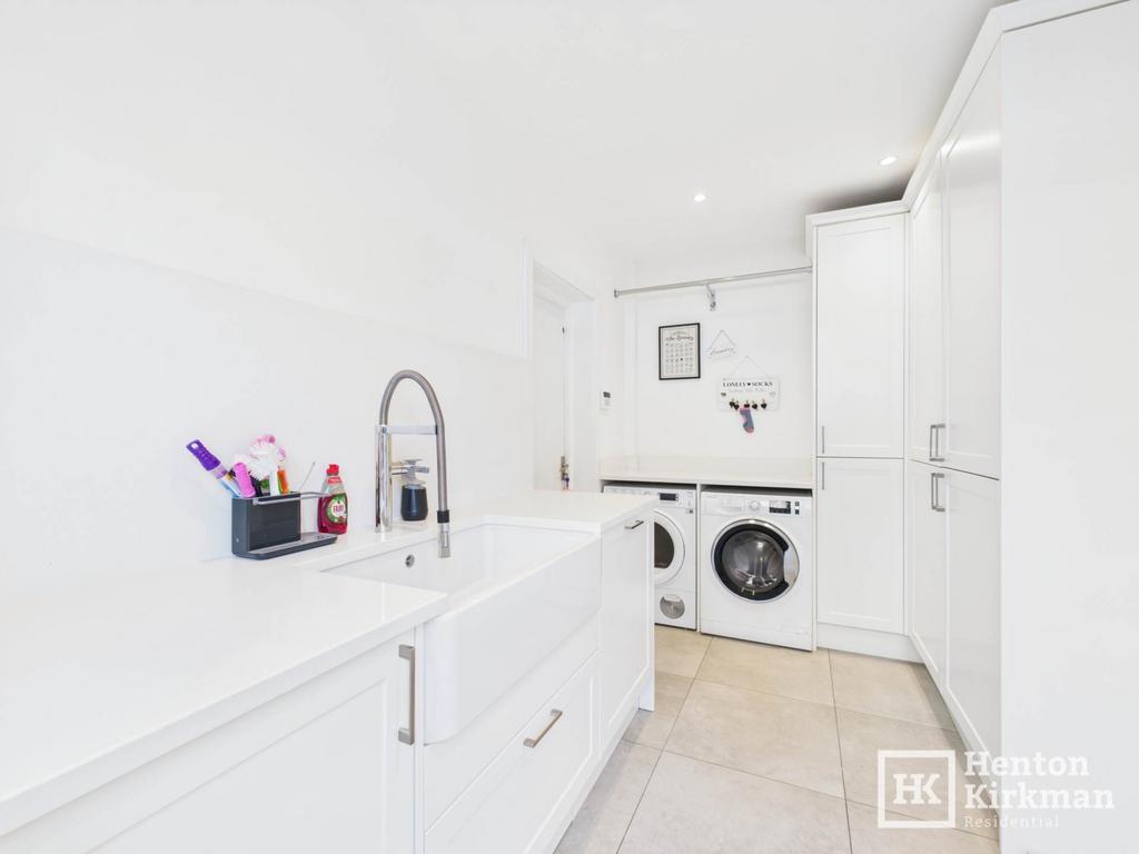 The tiled floor continues into the thoughtfully designed utility room, which features shaker-style cabinetry and Quartz worktops.