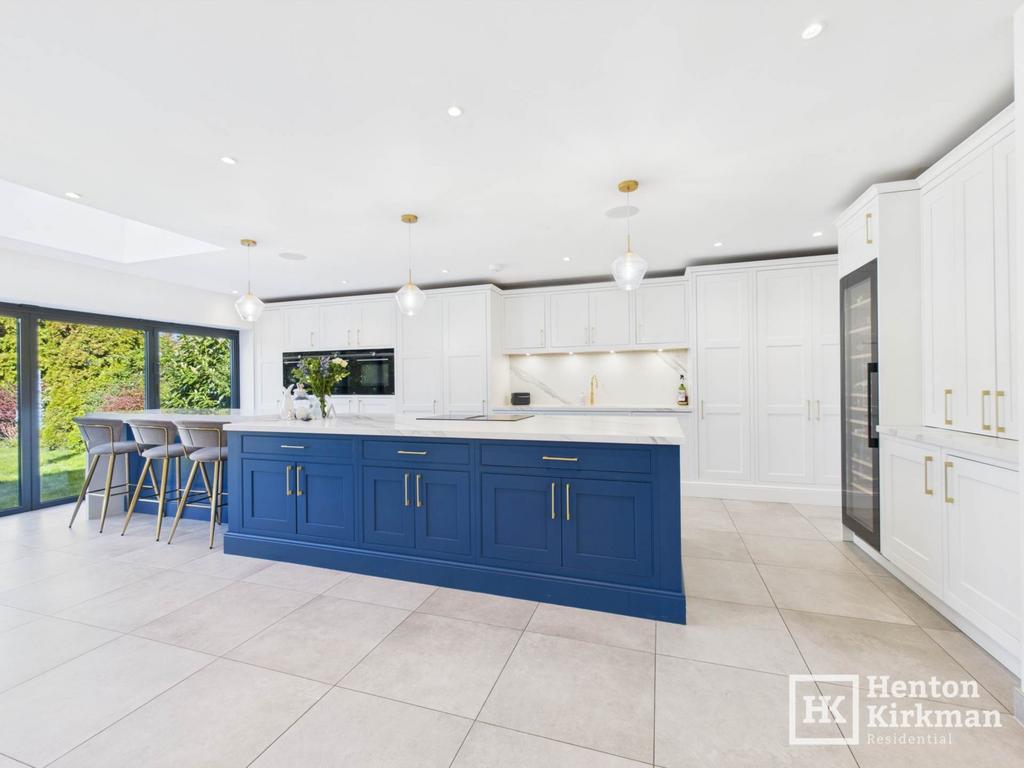 The centrepiece is a stunning 5m long island unit with one section wrapped in Corian and housing a six-person breakfast bar, nine deep drawers and should you need it, further cupboard space.