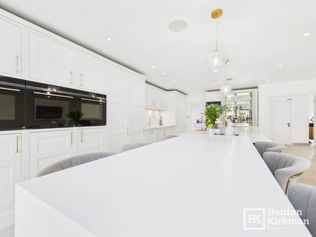 The centrepiece is a stunning 5 metre island, perfectly designed for entertaining or family gatherings. High-spec Siemens appliances include three ovens, a large fridge and freezer, drinks fridge, dishwasher, and a sleek halogen hob with a seamless built-in extractor. The cabinetry also incorporates a stylish breakfast cupboard and an elegant built-in bar, ready for guests!