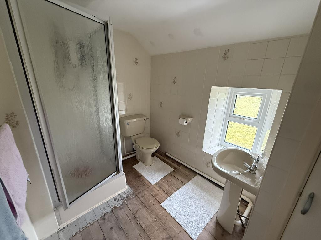 Low level flush WC pedestal wash hand basin, double glazed window to rear, tiled walls, glazed and tiled shower cubical with ‘Triton’ electric shower and shelved airing cupboard.