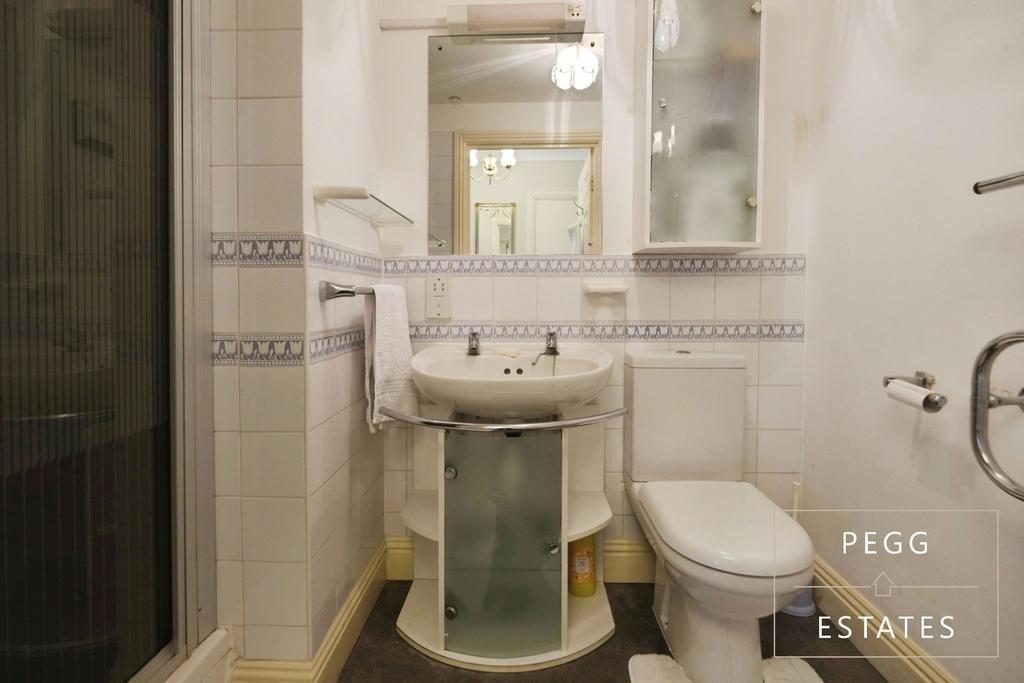Lino flooring, walk in corner shower cubicle, part tiled, shaver point, pedestal sink, low level wc, medicine mirror cabinet over, extractor fan, heated electric hand towel rail.