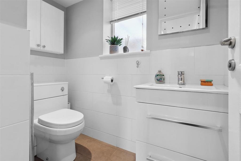 Modern white suite. Bath with shower attachment. W.C. Wash basin. Obscured window to rear. Heated towel rail. Extractor fan.