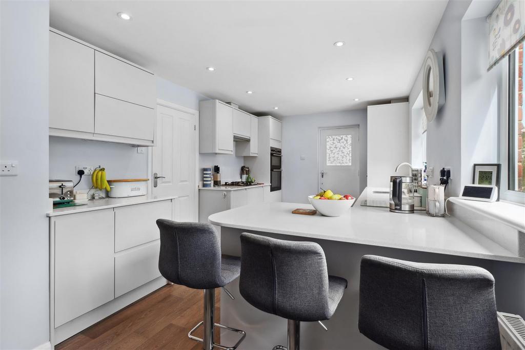 Modern white fitted units. Range of integrated appliances. One and a half sink and drainer. Breakfast bar. Two windows overlooking the rear garden. Space for fridge freezer. Wall-mounted gas combination boiler. Radiator.