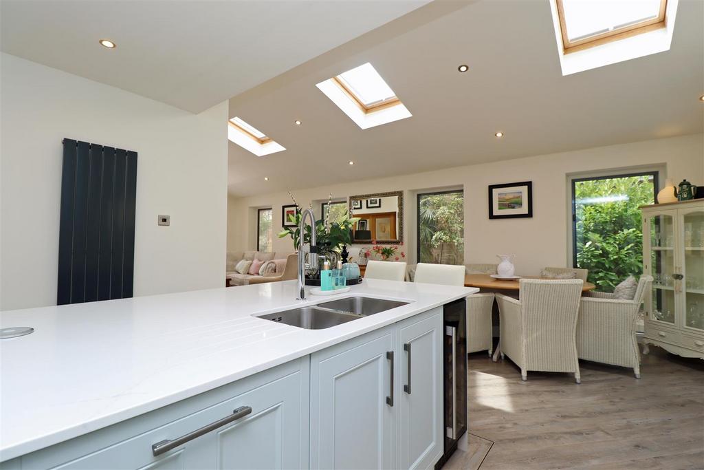 The accommodation is gas centrally heated via a recently installed combi boiler operated via a Hive smart control system and the extension benefits underfloor heating. The ground floor features Karndean flooring throughout and comprises a spacious lounge with a newly added feature media wall incorporating panoramic '3 sided' electric fire and with alcove display shelving. The impressive fitted kitchen features two ovens, microwave, coffee station, five ring induction hob, fridge/freezer, central island with sinks, wine cooler and pop up sockets/USB, all with Quartz worktops. The open plan layout flows through the full width dining/family room extension with lots of natural light from two sets of bi-fold doors and four Velux roof windows. A versatile study and WC complete the ground floor accommodation.