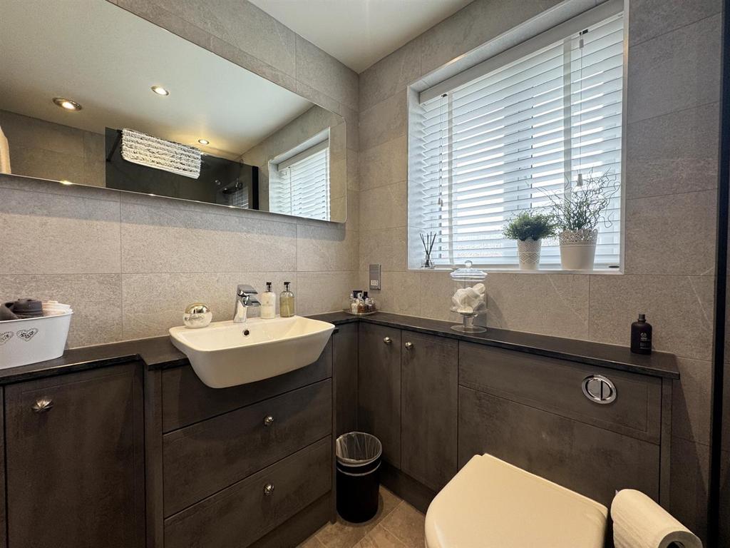 At upper level you will find a 24 ft master bedroom with Sharpes fitted wardrobes and an en-suite (originally 2 bedrooms and converted into one large master suite), two further bedrooms and the family bathroom with large walk in shower. The loft is boarded for storage, with two Velux windows, power and lighting.