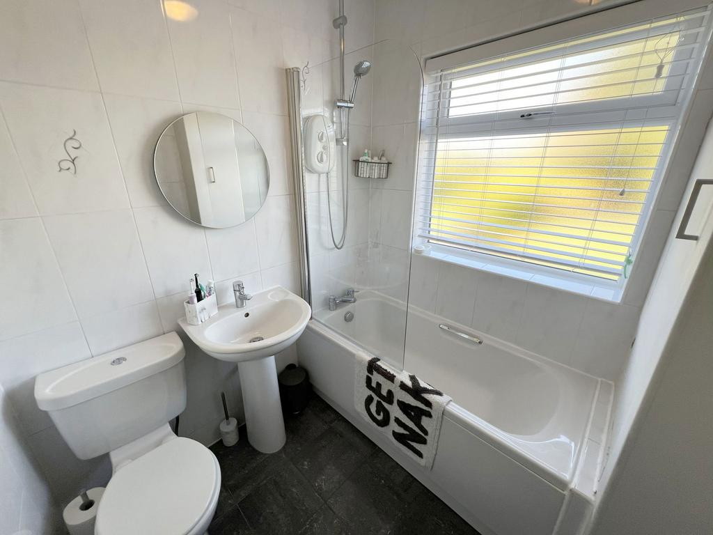 Being fitted with a three piece white suite comprising a panelled bath with electric shower over and glazed screen, low flush WC and pedestal wash hand basin. Tiling to walls, tiled flooring, obscure double glazed window to rear, ladder style radiator, airing cupboard and ceiling light point