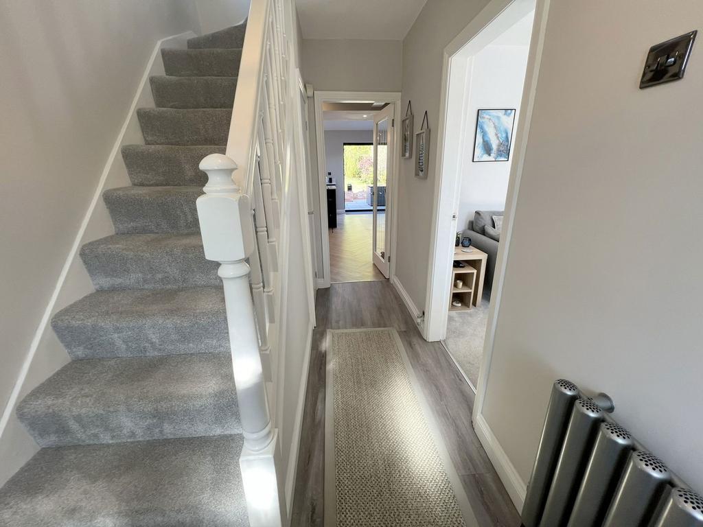 With single glazed obscure windows to the front elevation, feature radiator, stairs leading off to the first floor with useful under-stairs storage cupboard, wood effect laminate flooring and doors leading off to: