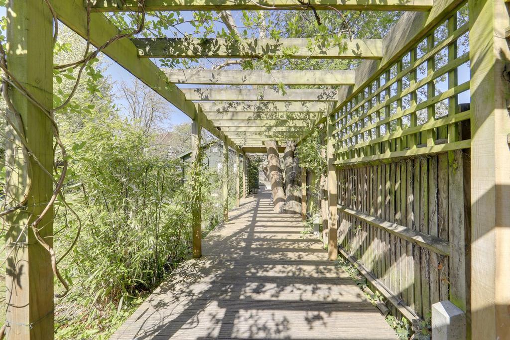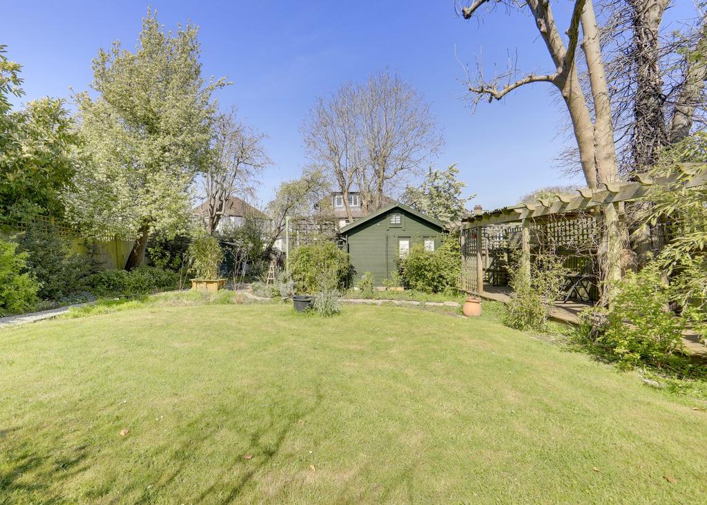 Private landscaped garden with large lawn, mature plant borders, pergola walkway leading to garden studio, rear patio and storage shed.