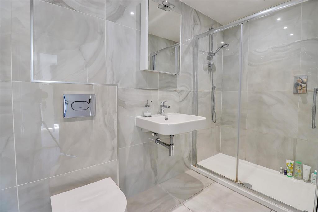 Three-Piece Shower Room - 2.78m × 1.46m (9'1" × 4'9") - Walk-in double shower, wall-mounted wash basin with chrome mixer tap, WC with hidden cistern, towel radiator, extractor fan, spotlighting, fully tiled walls and flooring.