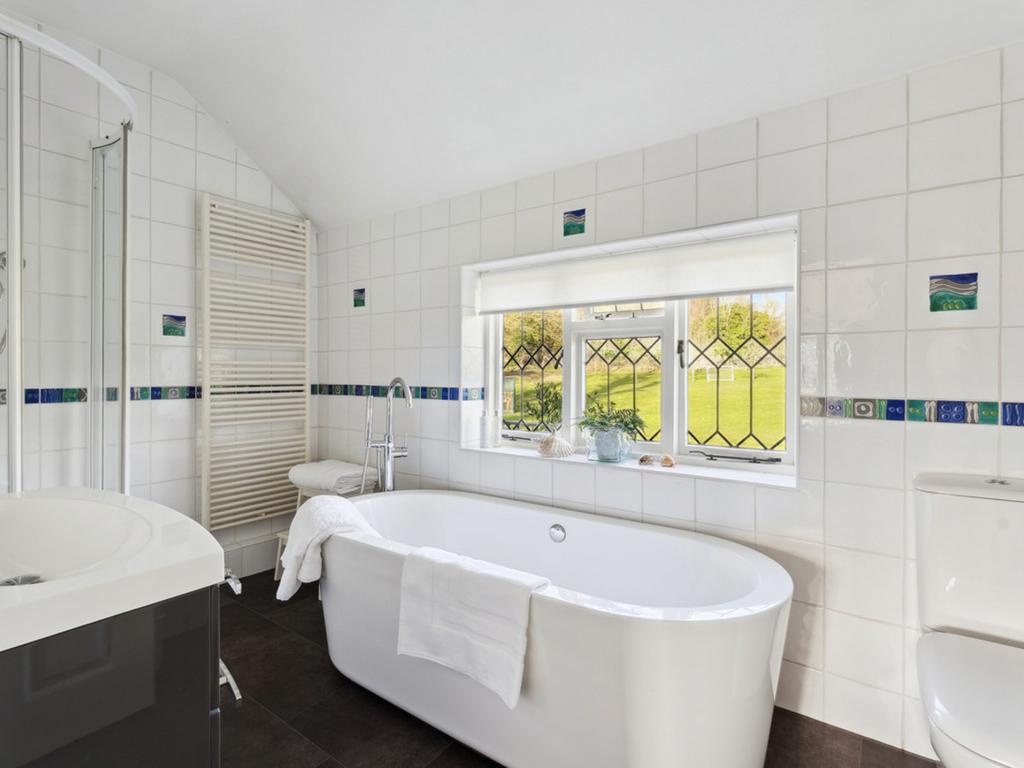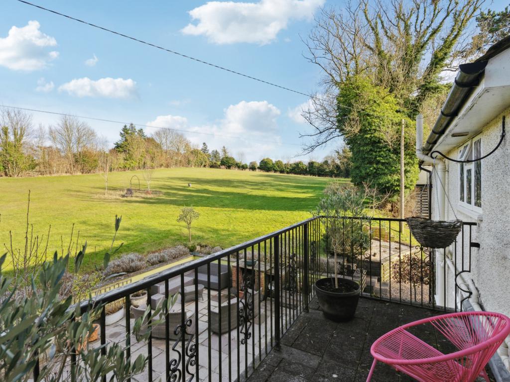 The two-level layout features a welcoming entrance hall that leads to a spacious sitting room with a cosy fireplace and a bright kitchen/dining area, complete with a utility room and cloakroom/WC. Upstairs, there are four generously-sized bedrooms; one offers an ensuite shower room and another provides access to a charming balcony with expansive garden views. Two additional bedrooms share a stylish family bath/shower room, along with a study that can serve as a fifth bedroom.