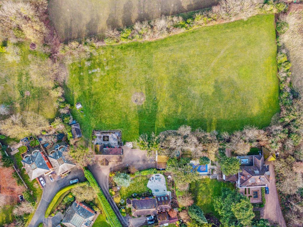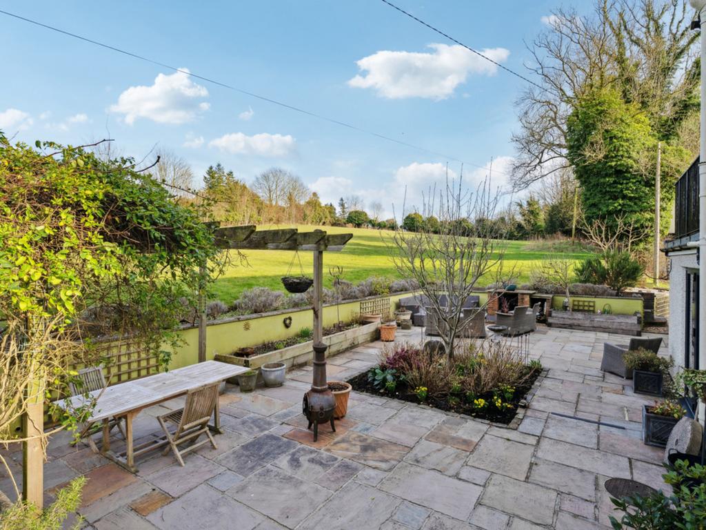 Nestled within private grounds, the property is set behind a gated driveway, surrounded by mature trees, and offers ample parking as well as outbuildings, including a garage with a studio and stables. A picturesque rear terrace with flowerbeds and a pergola creates a delightful space for outdoor dining.