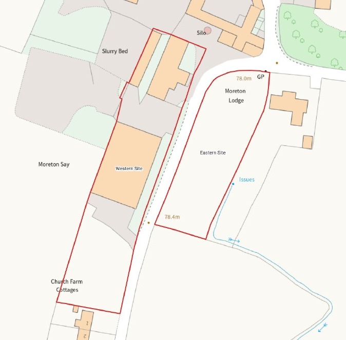 Directions: As you enter Moreton Say village from the south off the A41, the western site can be found on the left hand side immediately after the row of houses 'The Drumble'. The eastern site is opposite.
