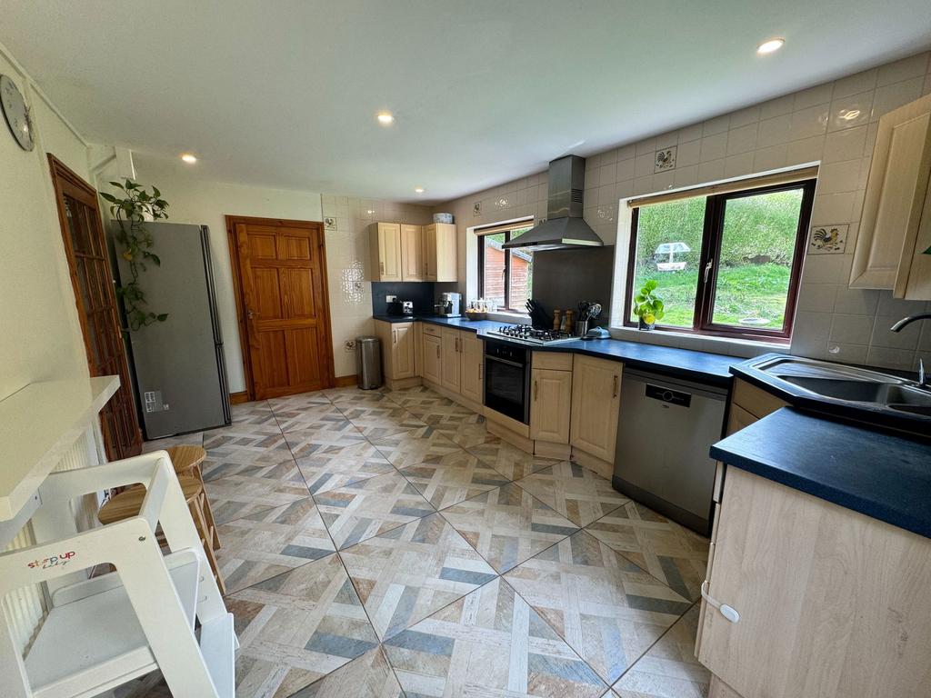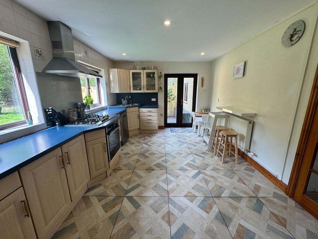 Upvc windows to rear, Upvc double doors to side. Fitted with a matching range of wall and base units with work top over, integrated cooker, gas hob and extractor hood. 1 1/5 sink with mixer tap, space for fridge freezer, tiled flooring and splash back, two sets of doorway to utility room.