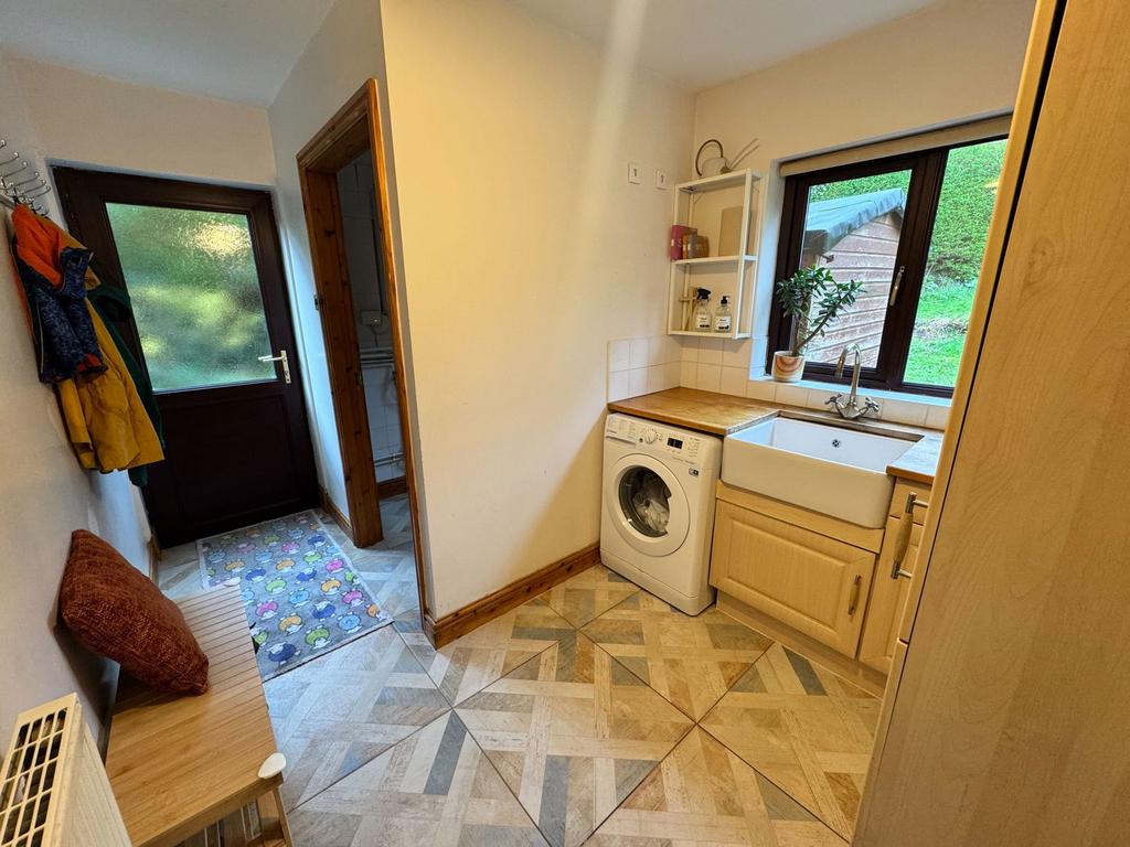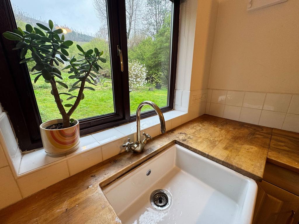 Upvc window facing the rear aspect. Upvc door leading to side access. Wall mounted base units with work surface over and larder unit, ceramic Belfast style sink with mixer tap. Plumbing for automatic washing machine or dishwasher. Tile flooring and tile splash back. Doorway leading to w.c.