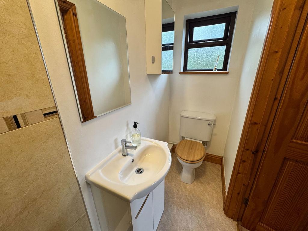 Upvc window with obscured glass to rear. W.c, wash hand basin, wall mounted gas combi boiler.