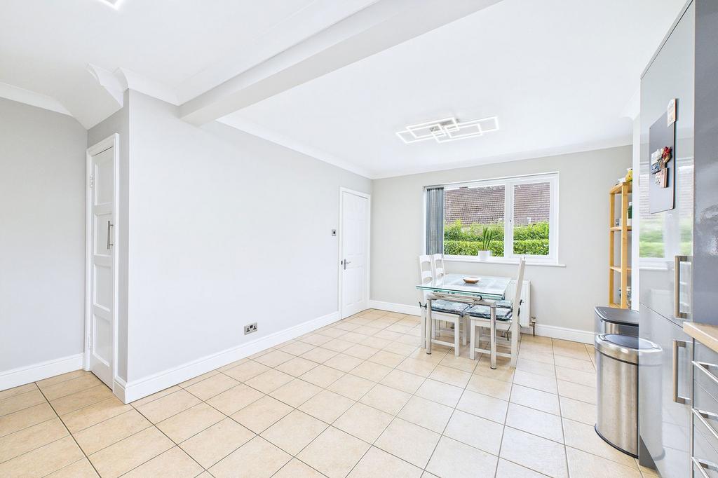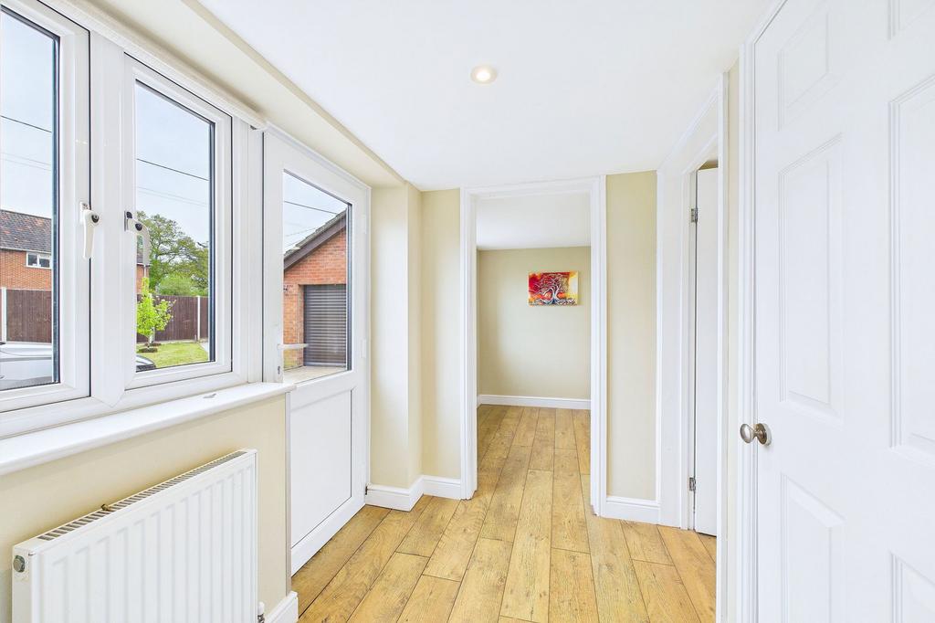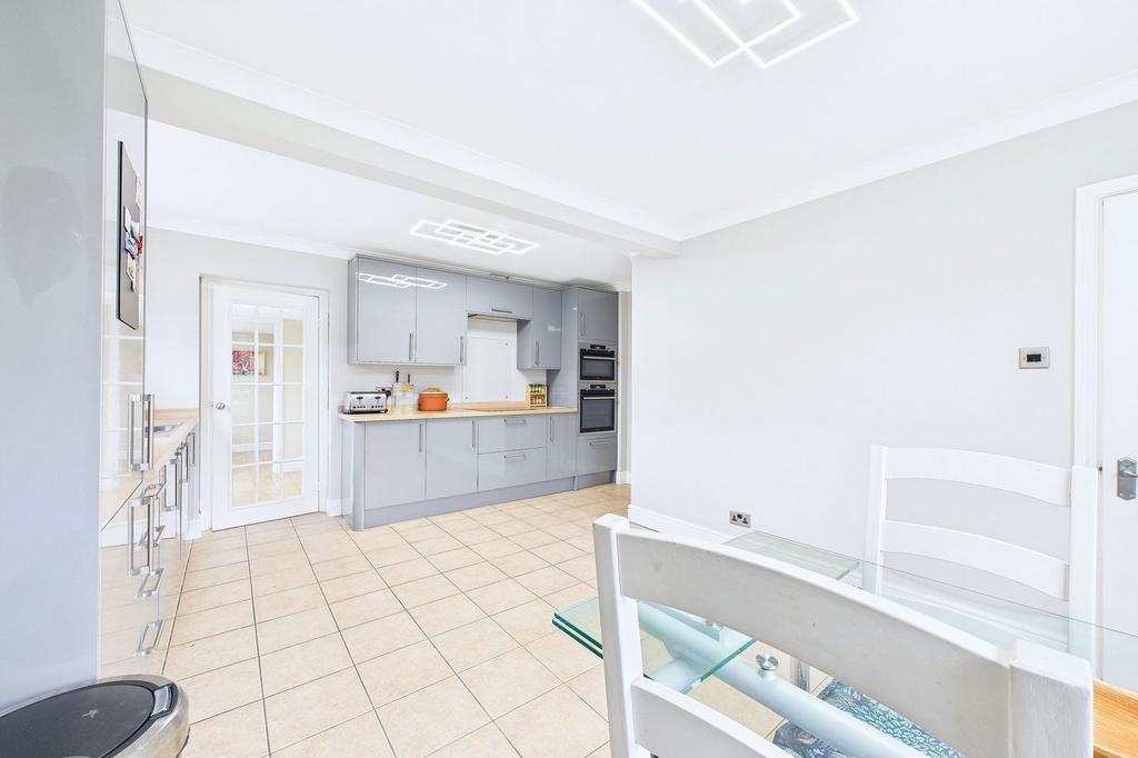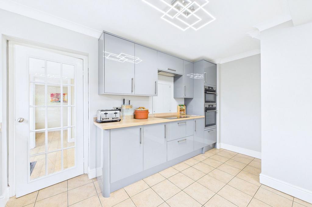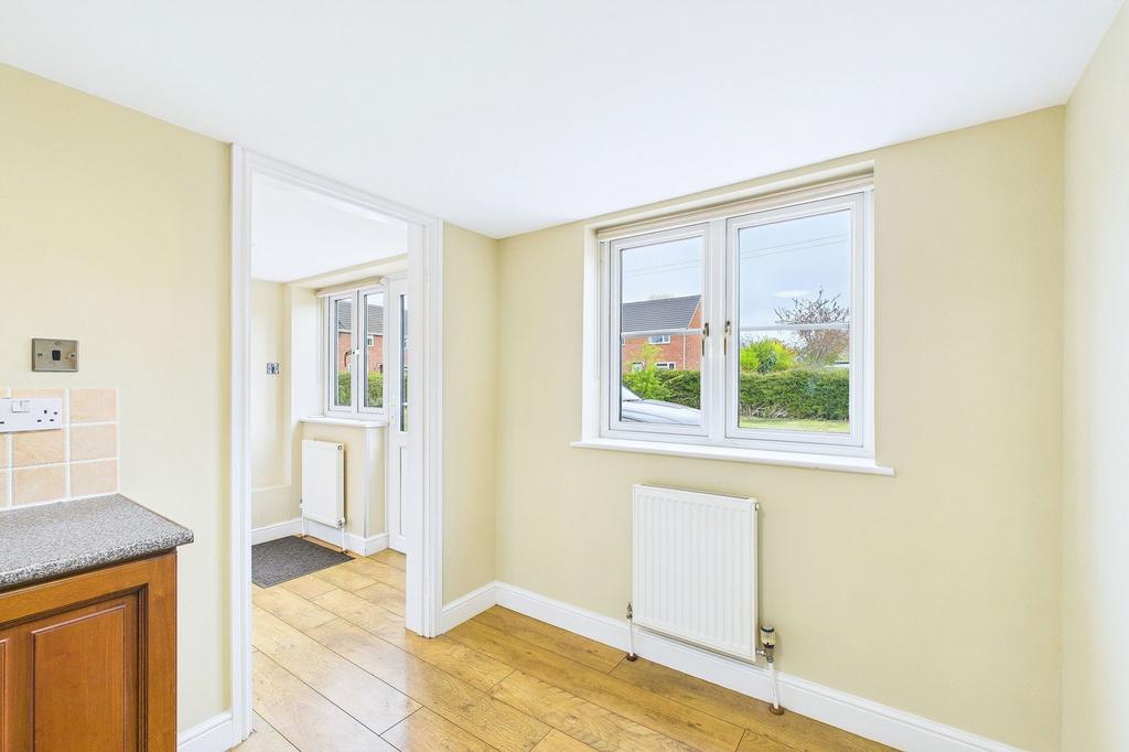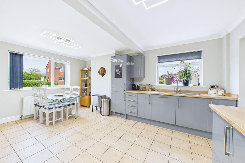 Kitchen/Diner Recently refitted kitchen/diner offering a stylish and functional space, perfect for modern family living. Fitted with sleek, matching high-gloss base and wall units complemented by solid wooden worktops. The double aspect design allows plenty of natural light to flow through, enhancing the bright and airy atmosphere. A stainless steel sink with mixer tap is set beneath one of the windows, while tiled flooring adds a clean and durable finish. Integrated appliances include a fridge freezer and dishwasher, along with an inset induction hob with cooker hood above. A mid-height double oven is thoughtfully positioned with a cupboard above and a deep pan drawer below. There's a built-in understairs cupboard providing useful additional storage, and ample space for a dining table and chairs. A fully glazed door leads through to the side porch and utility room.