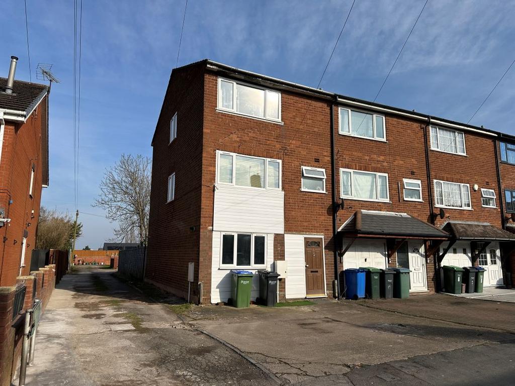 A five bedroom three storey end terraced townhouse standing back from the road behind a driveway.