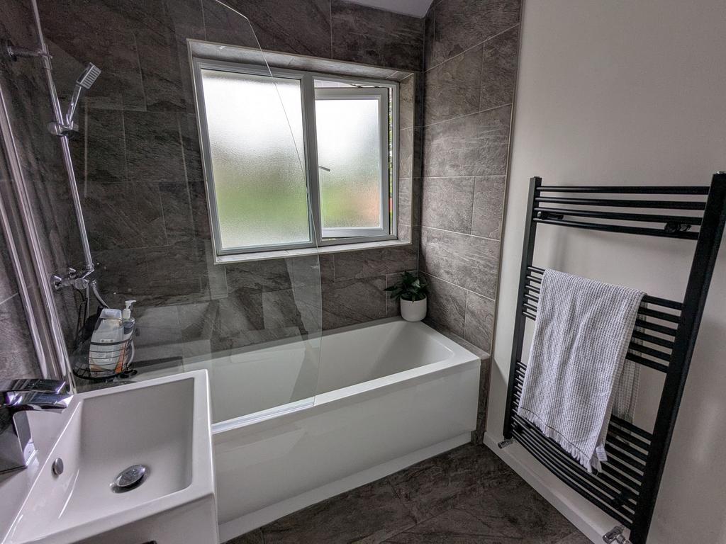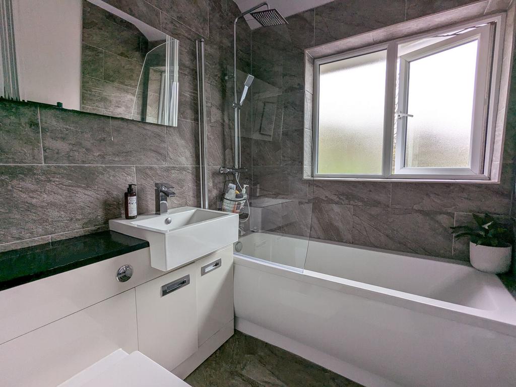 Opaque double glazed window to rear, panelled bath with mains shower, low level WC, wash hand basin, heated towel rail.