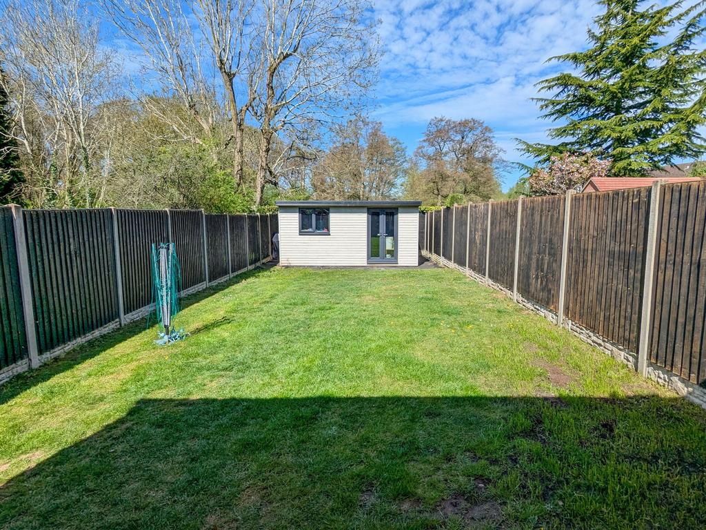 Mainly laid to lawn enclosed by timber fence boundary and gated rear access to open fields.