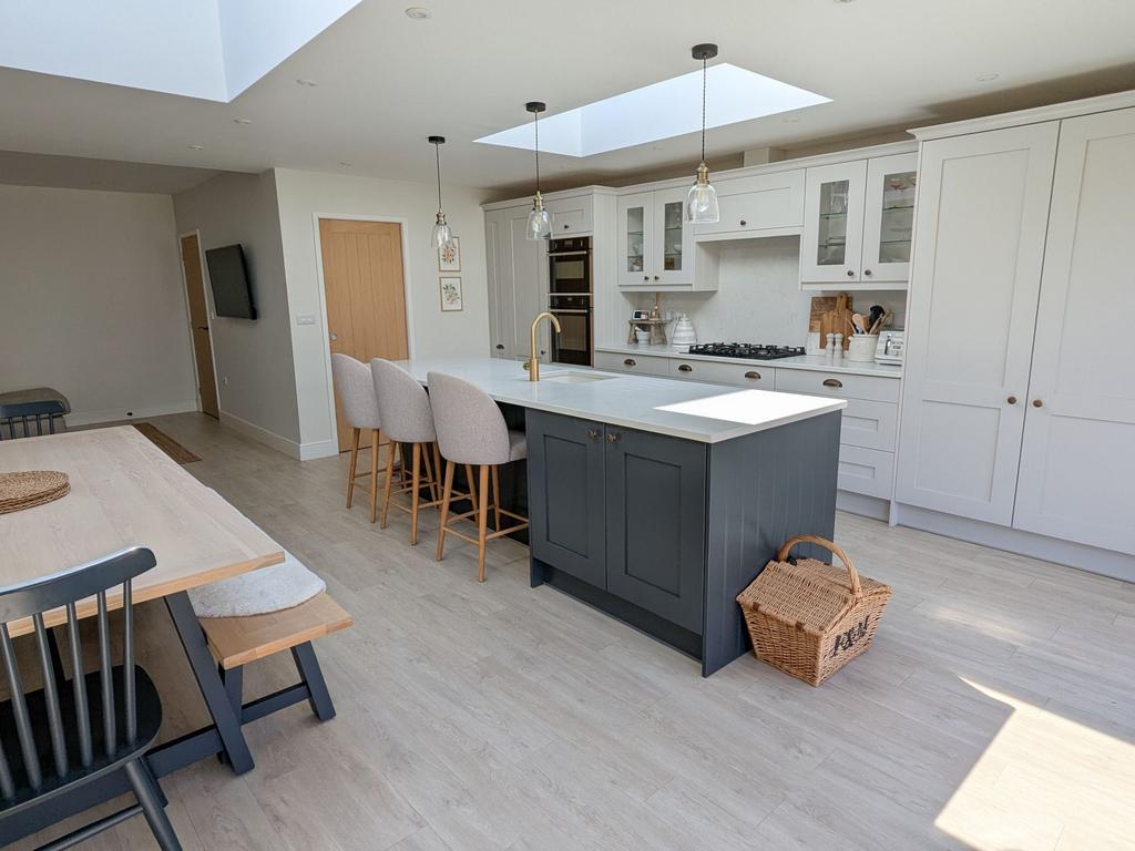 Beautifully designed with Bi-fold doors opening onto the rear garden, range of wall and base unit cupboards and drawers and breakfast bar, large windows in the roof, space for large dining table, integrated five ring gas hob with cooker hood, integrated electric oven and microwave oven.