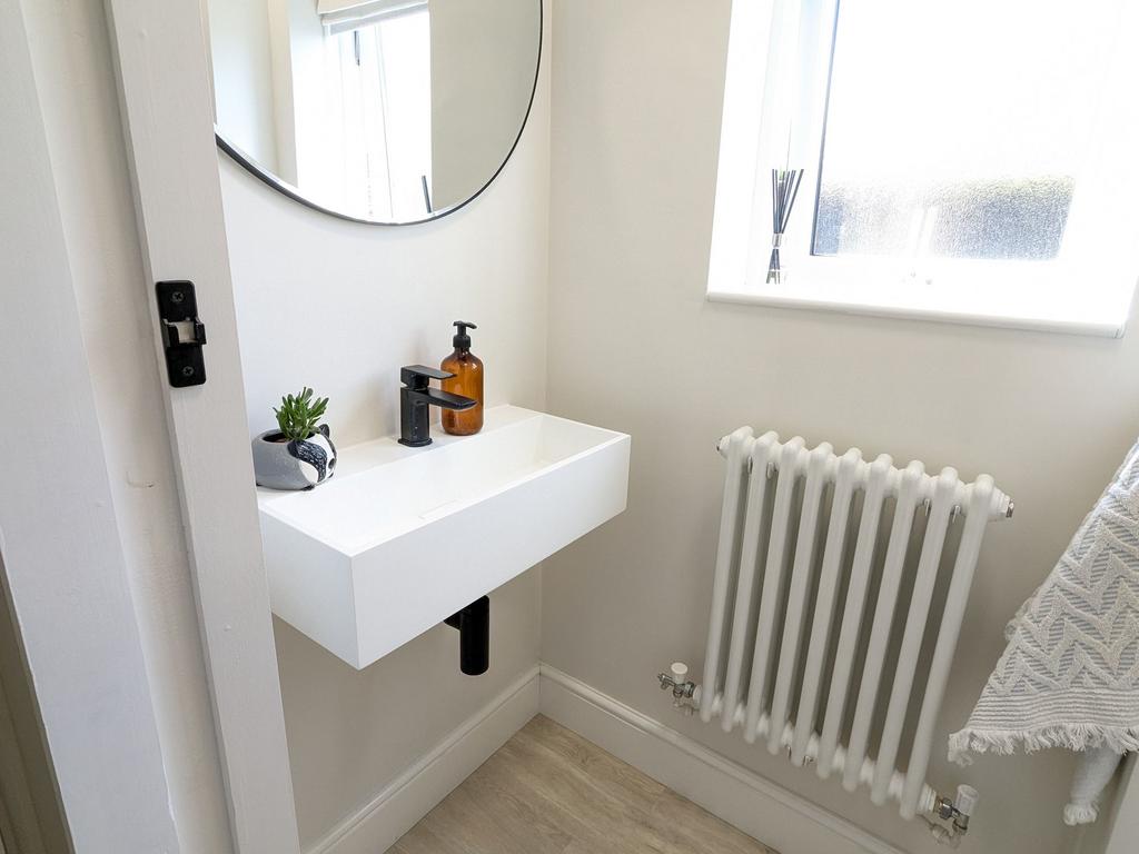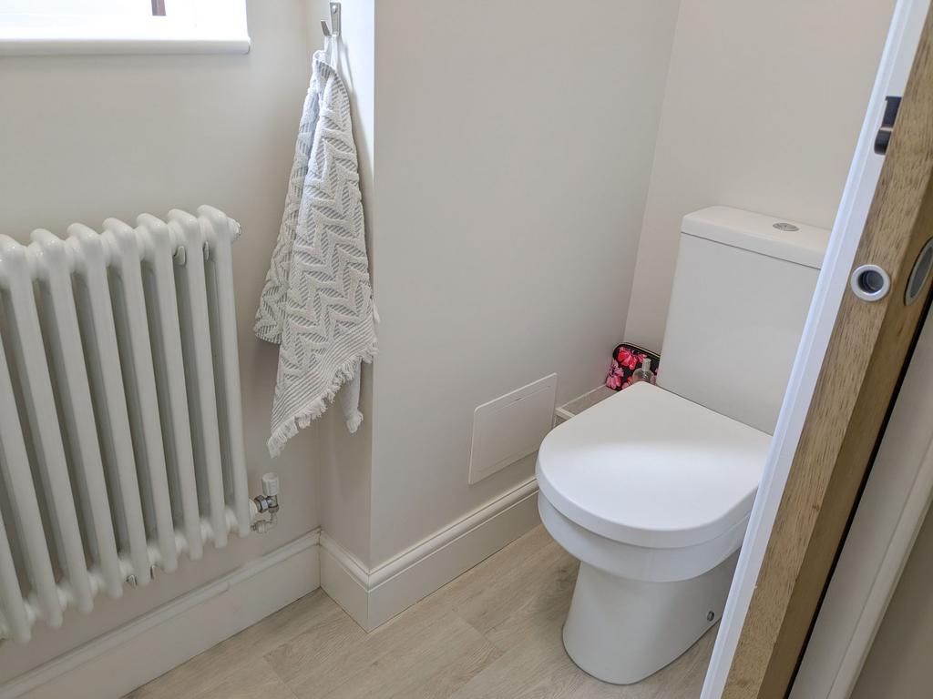Opaque double glazed window to side, low level WC, wash hand basin, radiator.