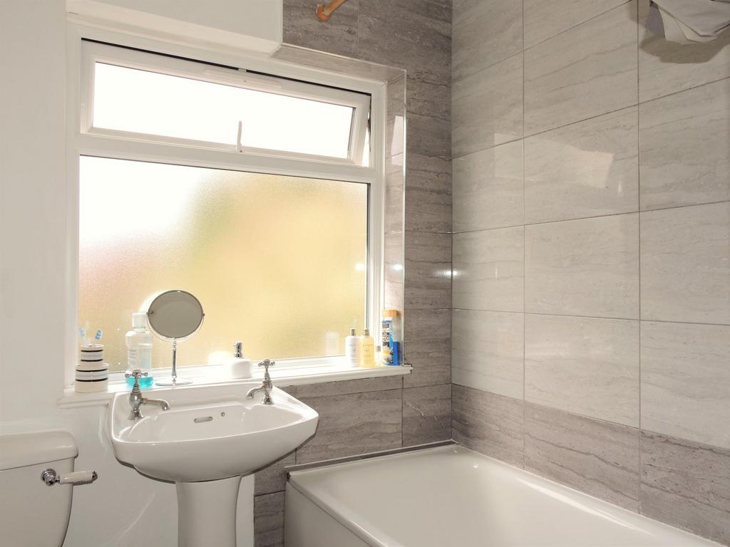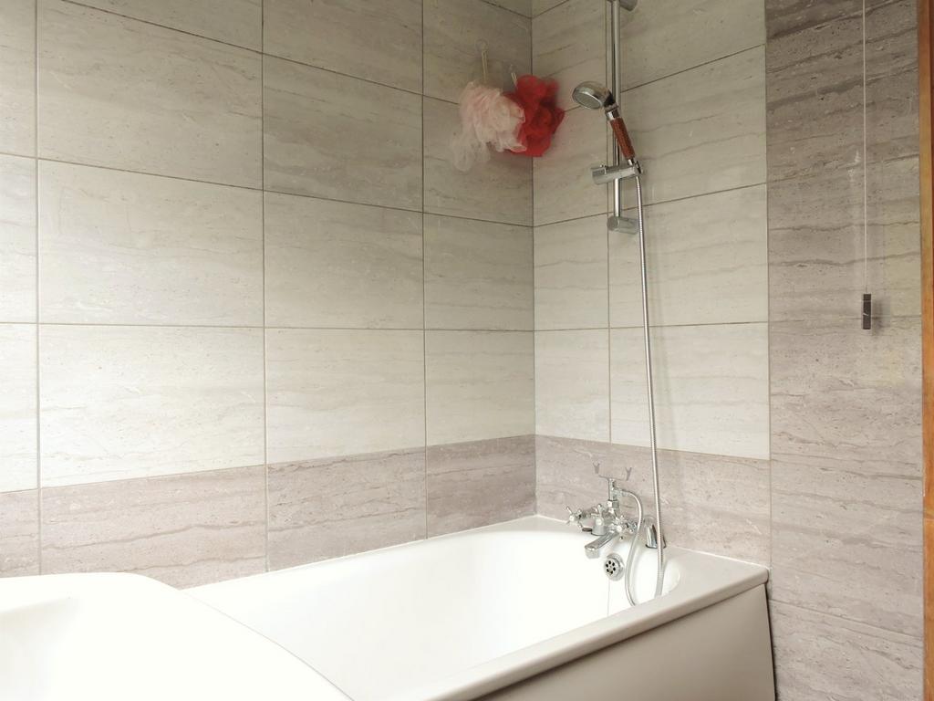 Fitted suite comprising of pedestal wash basin, low flush wc, paneled bath with mixer taps & shower attachments, partly tiled walls, tiled flooring, spot lighting, radiator and Upvc double glazed window to rear aspect.
