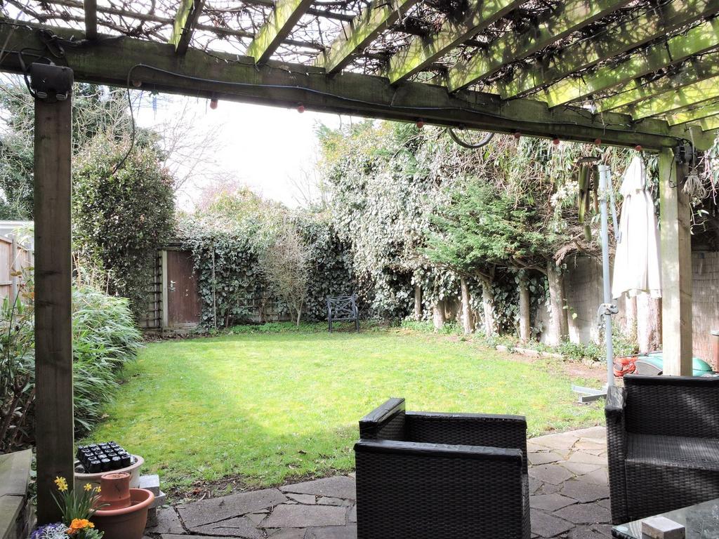 Patio are leading onto the lawn area with flower/shrub borders, exterior tap, exterior lighting and access to the garage.
