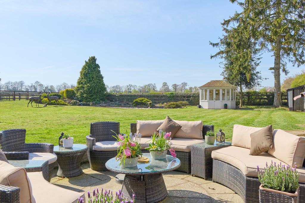OUTSIDE The property is approached by electric double gates opening onto an in-and-out carriage driveway, providing parking and turning for several vehicles. This, in turn, leading to the STABLE YARD, OUTBUILDINGS, and PADDOCKS. Formal gardens surround the property, with a pretty front garden set behind a manicured hedge line. The rear gardens enjoy an extensive dining terrace leading up to the lawn, which features a variety of trees and shrubs, along with a large carp pond, SUMMER HOUSE, and GREENHOUSE.