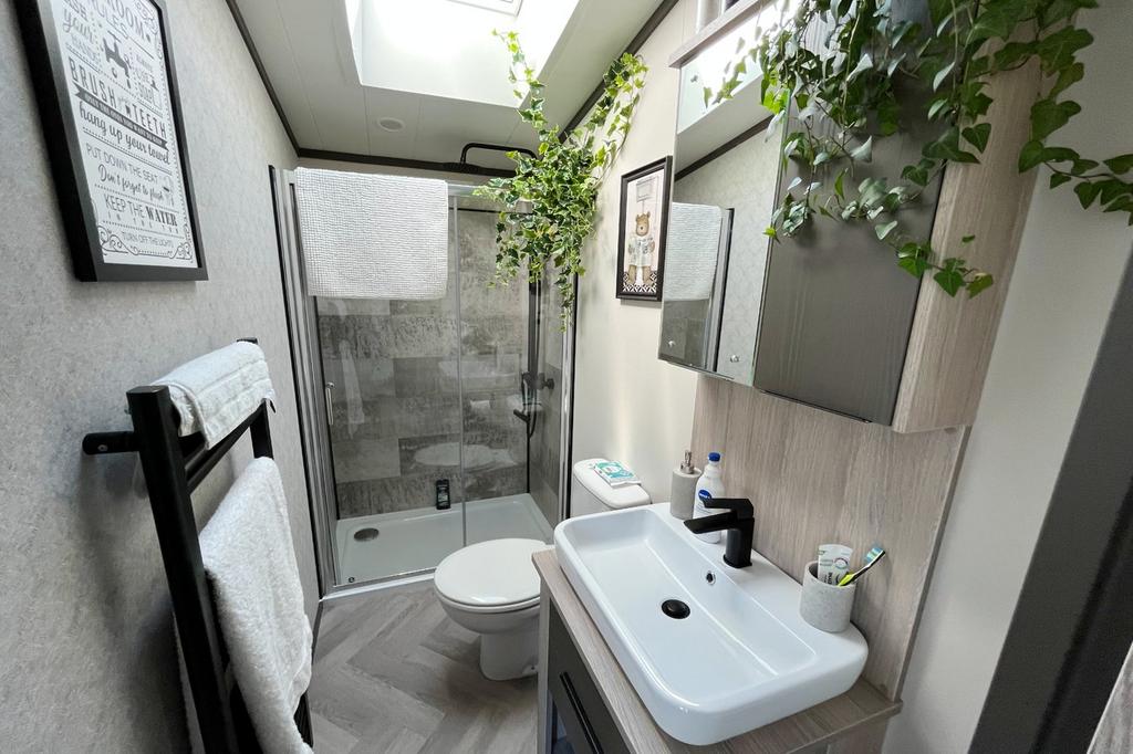 Velux window to rear, double width shower enclosure with thermostatic shower unit, bowl sink unit with cupboard under, low level WC. Ladder style radiator, extractor fan, wood effect flooring