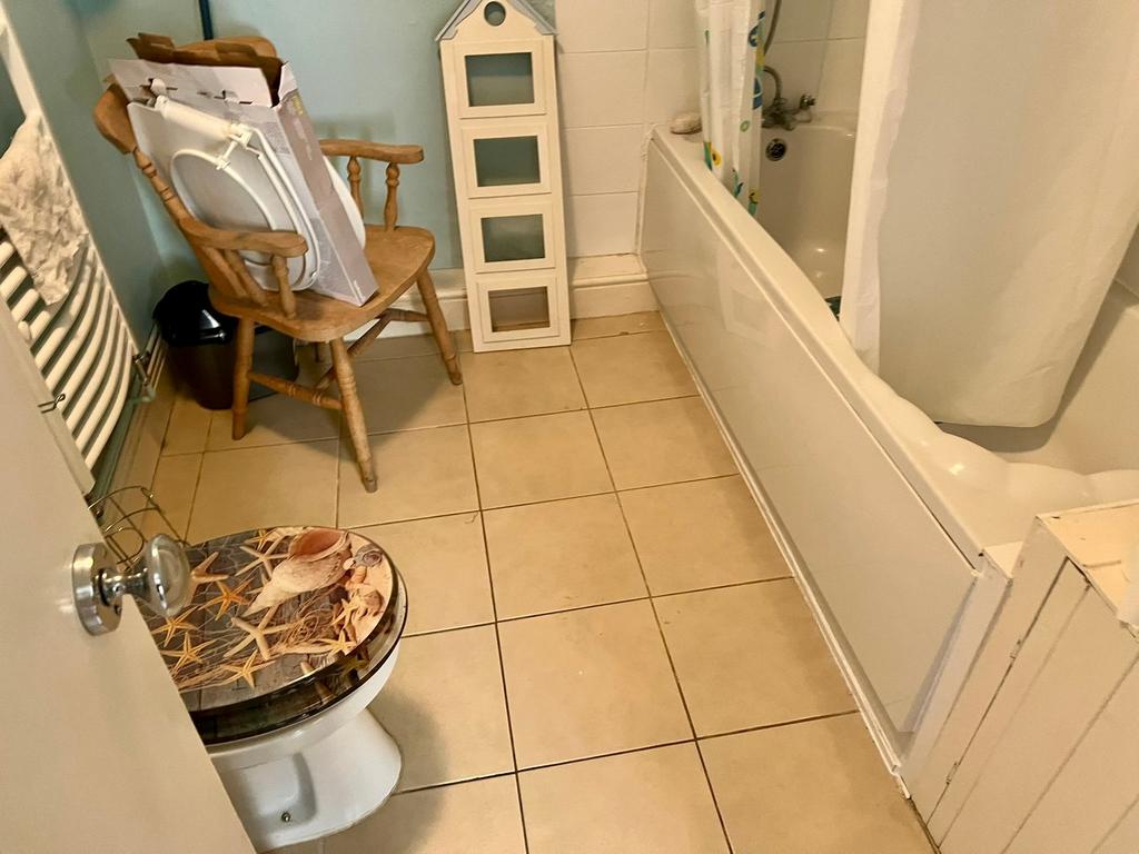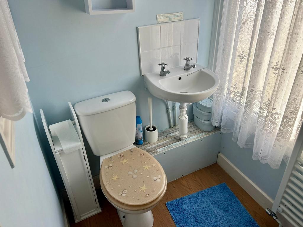 Suite comprising low level WC, pedestal wash hand basin, panelled bath. Tiled flooring, storage cupboard, coved and textured ceiling, heated towel rail.