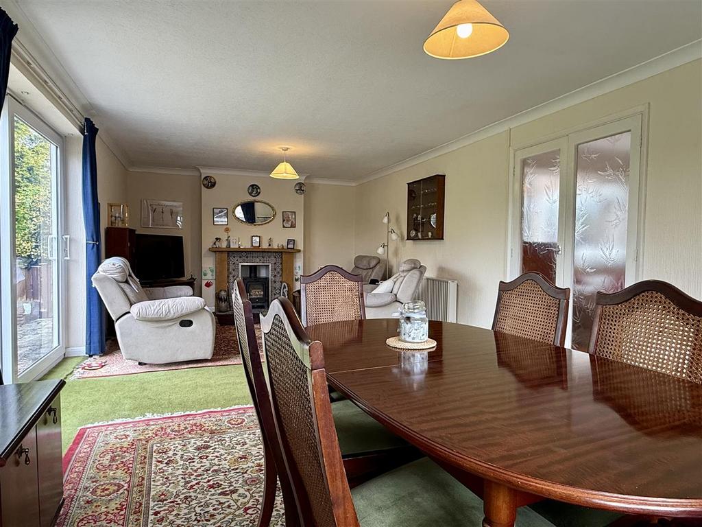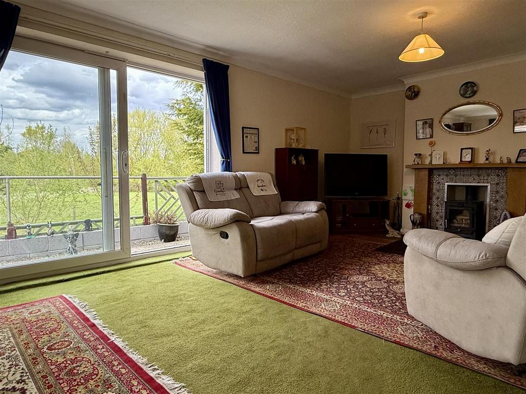 Spacious Lounge/Dining Room - With fitted carpet, two radiators, two ceiling light points, double glazed window, feature woodburning stone with mantle over, tiled surround and tiled hearth, double glazed window and double glazed sliding doors out to the rear with a view over a small orchard and open paddock.