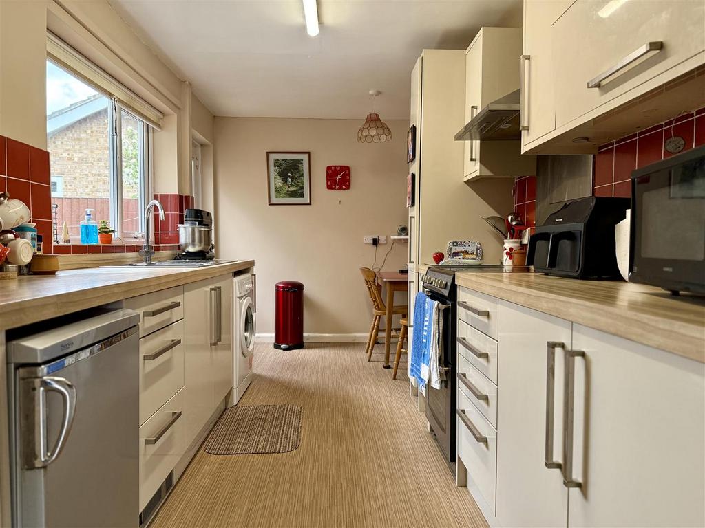 Kitchen/Breakfast Room - A modern fitted kitchen with matching wall and base units, ample work surface space, 1 1/2 bowl sink and drainer unit, with tiled splash backs, freestanding electric cooker, under counter space for larder fridge or freezer and plumbing for washing machine, space for a freestanding fridge or freezer, strip light, vinyl flooring, double glazed window and door looking out on to a small courtyard, ample space for a dining table.