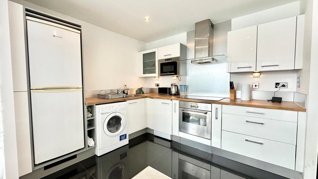The sleek, fully fitted kitchen is equipped with integrated appliances and modern finishes, seamlessly blending into the social living and dining space — ideal for both relaxing and entertaining.
