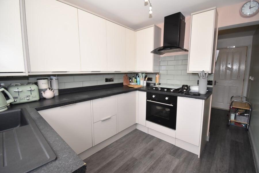 9’4” (2.84m) x 8’0” (2.44m). A modern kitchen fitted with a range of matching base, drawer and eye level cupboards. Granite effect work surfaces with tiled splashbacks. Fitted oven. Four ring gas hob with filter/extractor hood over. Single drainer sink unit with modern style mixer tap. Integrated dishwasher. Wall mounted concealed boiler serving central heating and hot water supply. Radiator. uPVC double glazed window and door providing access and outlook to rear garden. Doorway opens to: