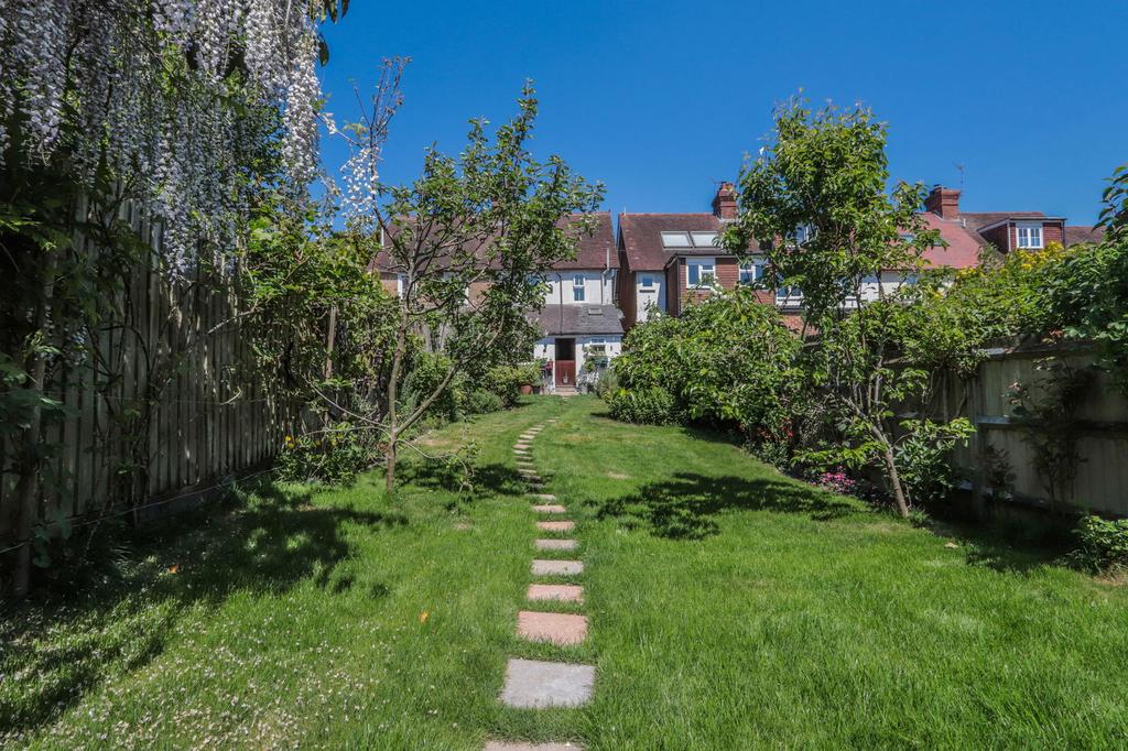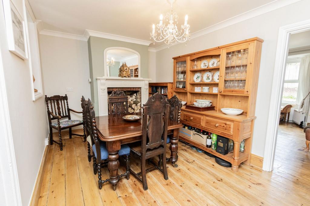 Flowing from the living room is the dining room, ideal for entertaining or family meals, also boasting original wood flooring. This leads into a well-appointed kitchen, which features fitted base units, a range cooker, and a dishwasher. From here, enjoy views over the impressive 120ft rear garden. The kitchen also provides access to a handy shower/utility room.