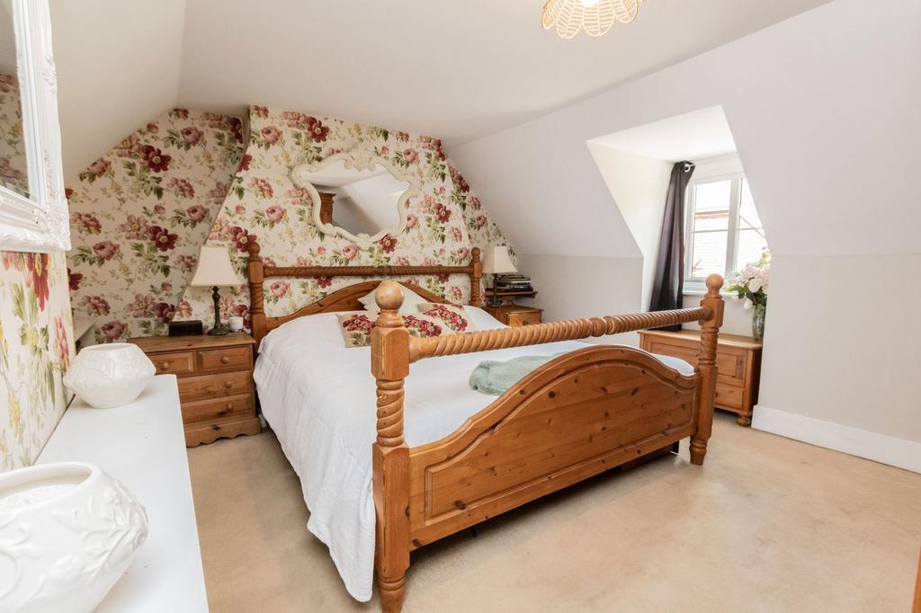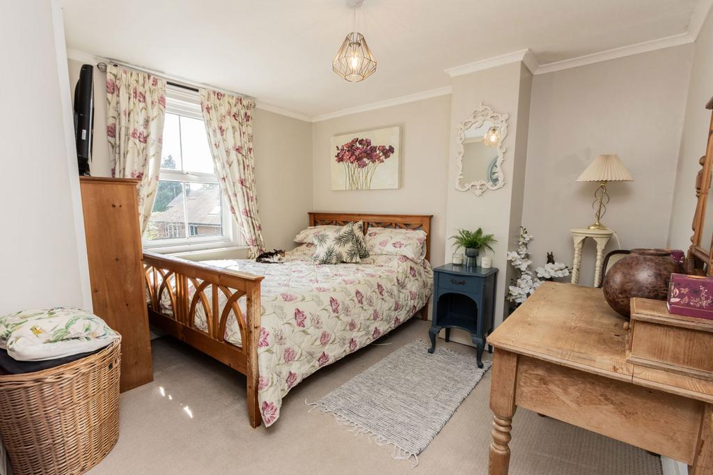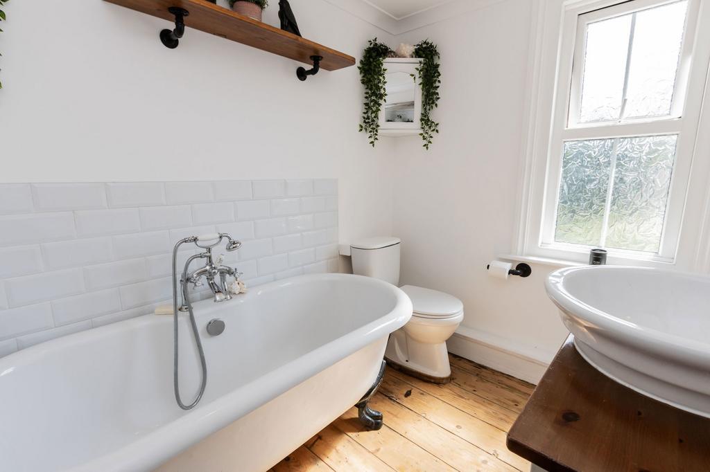 Upstairs, the first floor features two bedrooms and a character-filled bathroom complete with a roll-top, claw-foot bath. A further staircase leads to the top floor, where you'll find a spacious double bedroom with roof windows offering views to the front.