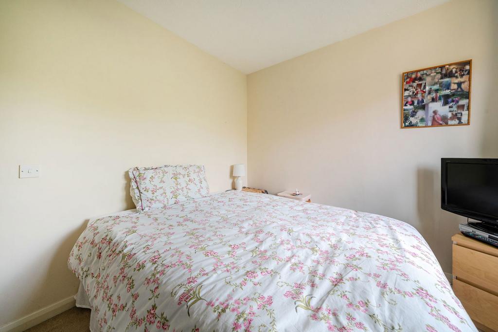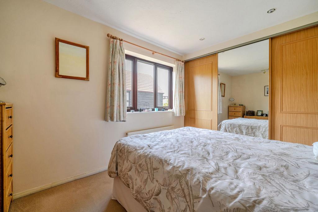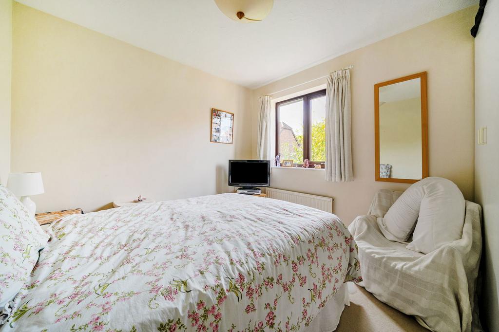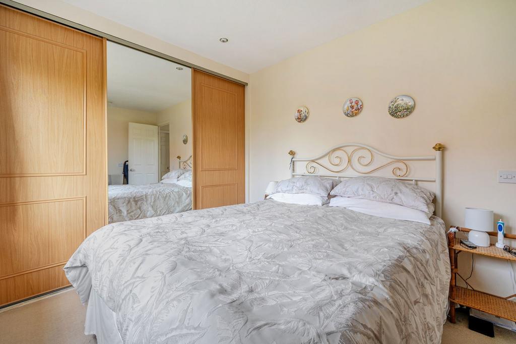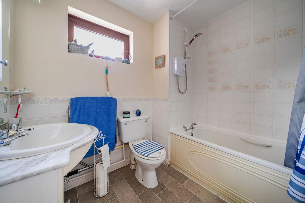 Upstairs, a bright landing leads to three comfortable bedrooms. The principal room spans almost fourteen feet and enjoys garden views plus a wall-to-wall run of mirrored wardrobes. Bedroom two is another generous double with built-in storage, while bedroom three makes an ideal nursery or home office. All three rooms share a neatly kept family bathroom with a white three-piece suite and an electric shower over the bath.