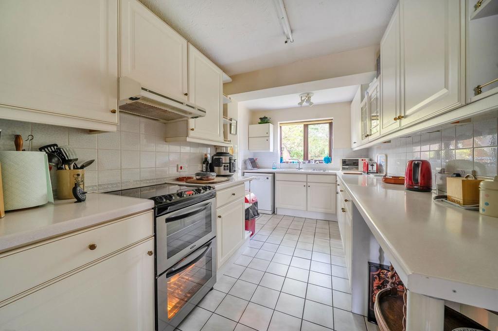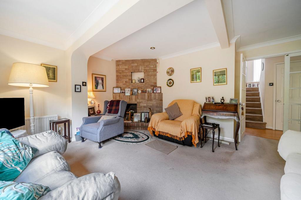 NO ONWARD CHAIN This attractive detached home greets you with a double-width driveway in front of the garage and a neat lawn framed by established shrubs. Stepping through the covered porch, a welcoming hallway offers space to hang coats, an understairs cupboard and a handy cloakroom. On the left, the bay-fronted dining room works equally well as a study or playroom. Straight ahead, a full-depth reception room stretches more than seventeen feet; an exposed-brick fireplace forms a cosy focal point while sliding doors open directly onto the garden, feeling like an extension of the living space. The kitchen sits at the rear, overlooking colourful borders; cream-fronted units, extensive work surfaces and an eye-level double oven make for an easy workspace, and a side door links to the passageway and garage.