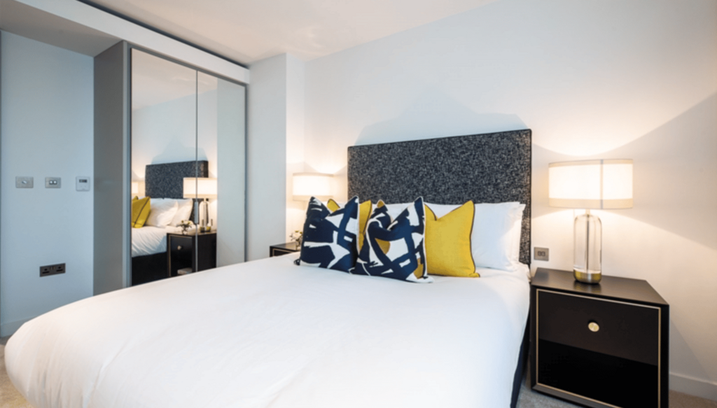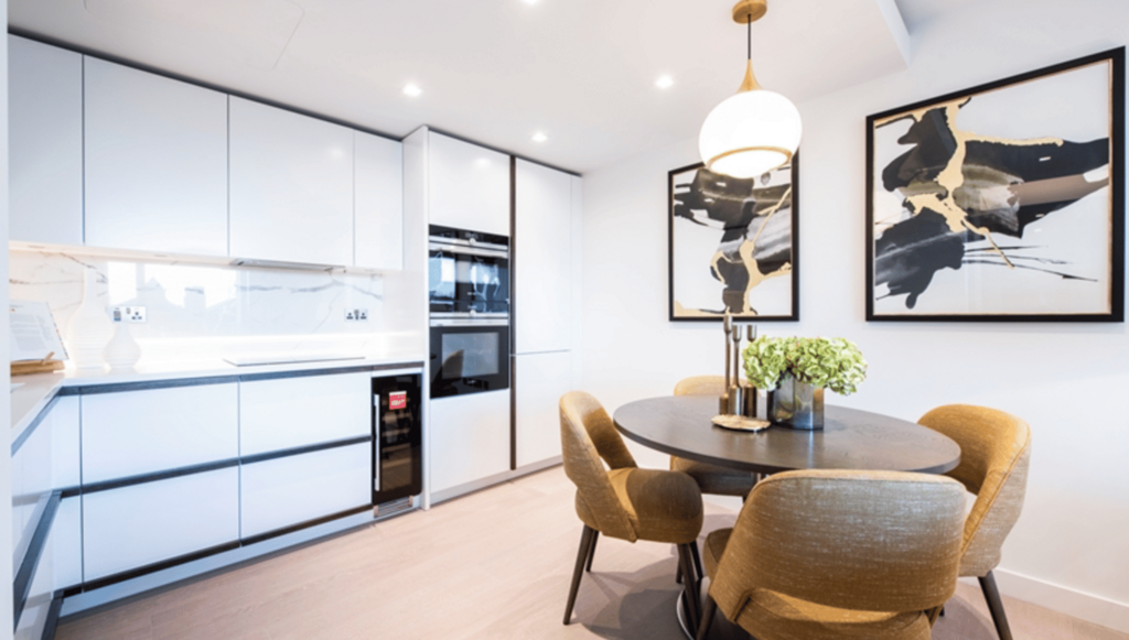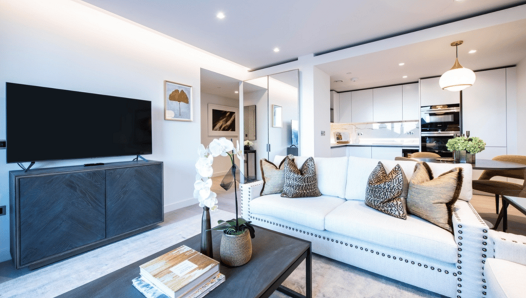A luxurious interior designed two-bedroom 5th floor apartment set over 842 SqFt comprising a large open-plan reception room leading onto a private balcony. The fully integrated kitchen with appliances from Siemens and Miele including oven and induction hobs, large fridge freezer and dishwasher and wine chiller all inset into a composite stone work tops. The whole apartment also benefits from comfort cooling.