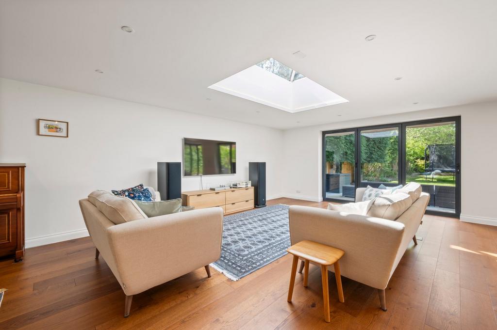 The accommodation is further enhanced by two contemporary bathrooms and a well-appointed utility/shower room on the ground floor. Externally, the property benefits from a substantial gated in-and-out driveway providing ample off-street parking. To the rear, a landscaped south-west facing garden offers a private outdoor space with expanse of lawn, ideal for family recreation and al fresco dining. Conveniently located within walking distance of Walton-on-Thames mainline station, with fast and frequent services to London Waterloo in approximately 28 minutes, this exceptional home combines luxurious living with excellent connectivity.