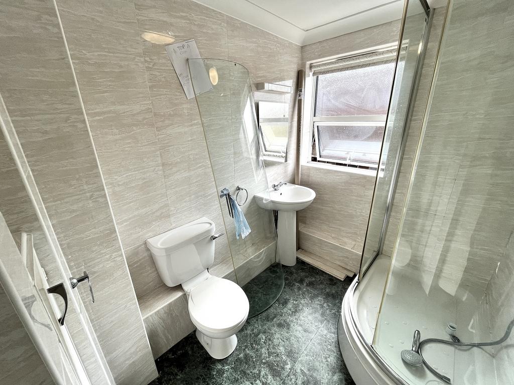 The upper level provides a good size washroom which is mostly tiled throughout, has decorative flooring and holds a three piece suite; handwash basin, toilet, and enclosed shower cubicle.